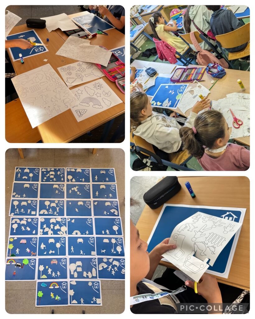 In den Klassenräumen haben die Klassen ein eigenes Verkehrszeichen für die „Spielstraße“ gestaltet. Sie durften auf ein großes Schild Elemente kleben und entscheiden, wie ihr Verkehrsschild aussehen soll.