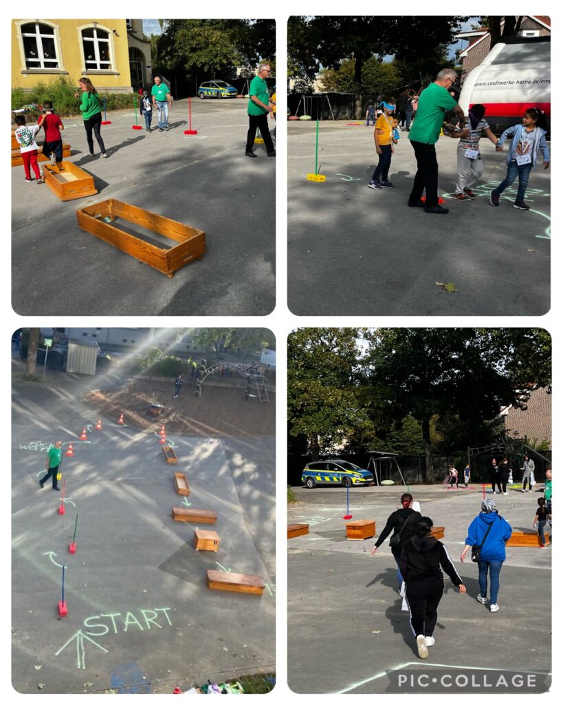 An der 2ten Station durchliefen die Kinder mit verbundenen Augen einen geführten Parcours. Dies soll die Kinder für mobilitätseingeschränkte und sehbehinderte Menschen im Verkehr sensibilisieren. Es war nicht einfach den Parcours abzulaufen.