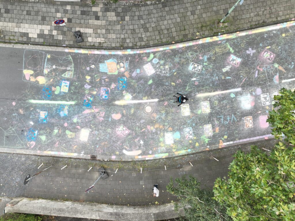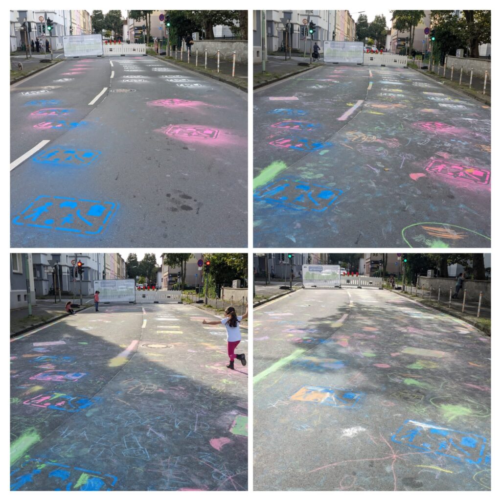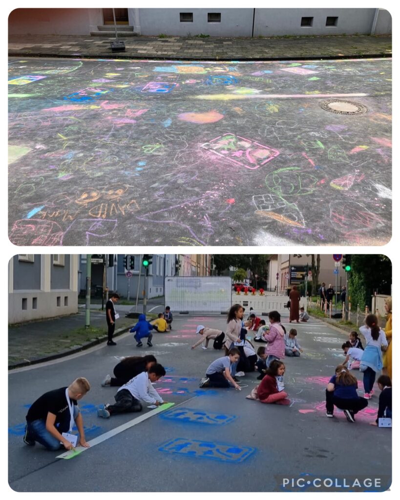 An Station 1 haben die Kinder auf die Straße vor der Schule ein Verkehrsschild gesprüht und dieses anschließend mit Kreide bemalt.